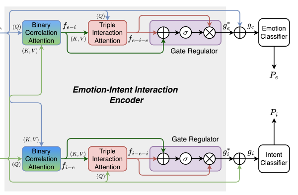 논문의 저자는 단순히 hidden state를 공유하는 것만으로는 두 task간의 명시적인 information을 전달하기에 충분하지 않다고 합니다. 그래서 복잡한 상관관계를 고려하여 두 task간의 상호작용 정보를 학습하기 위해 Emotion-Intent Interaction Encoder를 제안합니다. 위의 Figure 2의 그림 일부분을 통해, Emotion-Intent Interaction Encoder가 emotion과 intent 예측을 위한 두개의 branch로 구성되어 있고, 각 branch가 Binary Correlation Attention, Triple Interaction Attention, Gate Regulator로 구성되어 있음을 확인할 수 있습니다. 그럼 각각의 구성요소가 무슨 역할을 하는지 설명드리고자 합니다.
