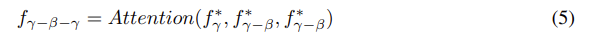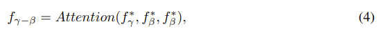 Triple Interaction Attention은 두 task 간의 깊이 있는 상호작용 정보를 탐색합니다. 두 task의 전반적인 상호작용 feature를 얻기 위해 각 branch에서 binary correlation와 task별 정보를 통합합니다. 논문의 저자는 이 과정에서 계단식 상호작용 feature representation을 계산하는 triple interaction attention을 제안합니다. triple interaction attention을 통해 binary correlation attnetion의 output을 $f_e, f_i$와 함께 input으로 받습니다. 두 task의 depp interactive information $f_{\gamma-\beta-\gamma}$는 다음과 같이 얻을 수 있습니다.