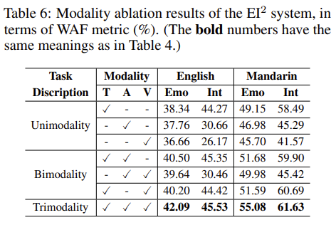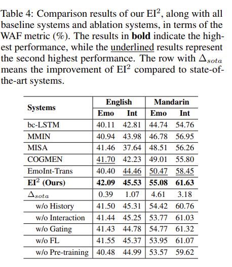 Table 4를 통해서 본 논문에서 제안된 방법론인 $\text{EI}^2$의 성능을 보시면 다른 방법론의 비해서 Emotion, Intent 모두 성능이 뛰어난 것을 볼 수 있습니다. English 데이터셋에서는 매우 큰 성능 차이가 보이지 않을 수도 있는데, Mandarin 데이터셋에서는 무려 이전 방법론과 4% 이상의 Emotion 성능이 나는 것을 파악할 수 있습니다. 해당 방법론이 본 논문의 저자가 지적한 문제 상황을 잘 해결했다는 것을 성능으로 볼 수 있는 부분인 것 같습니다.
