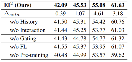 먼저, ‘w/o History’는 $\text{EI}^2$에서 multimodal history encoder를 없앤 버전,