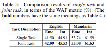 본 논문에서는 다하게 ablation study를 수행하였는데요. Table 5를 통해서 task ablation의 실험 결과를 볼 수 있습니다. Table 5를 통해서 single task로 학습했을 때의 성능과 joint task로 학습했을 때의 성능을 보면 joint task의 성능이 모두 높은 것을 볼 수 있습니다. 이를 통해서 emotion과 intent 간에 강한 상관관계가 있음을 확인할 수 있습니다.