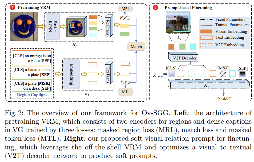 visual-relation 모델을 사전 학습하는 방법은 주어-술어-목적어(SPO) relation triples으로 구성된 Ob(base object categories)를 사용하여 visual-relation 공간을 학습하는 것입니다. 그러나 이러한 방식은 Ob의 수가 적기 때문에 과적합 문제를 야기할 수 있습니다. 따라서 저자는 open vocabulary relation를 사용하여 모델을 학습하는 것을 고려합니다. 추가적으로, 대부분의 VL 모델은 image-caption 쌍의 global 텍스트 의미와 visual 정보를 맞추려고 시도하지만 동일한 객체가 이미지 내에서 다른 객체와의 relation에 따라 장면 그래프에서 다른 relation를 가질 수 있습니다. 따라서, 사전 학습된 모델은 visual 요소를 regional context에 따라 다양한 relation으로 매핑할 수 있어야 합니다. 이를 해결하기 위해 저자는 Visual Genome의 dense-caption을 사용하여 두 개의 Transformer 기반 인코더(이미지, 텍스트)를 사용해 regional context-aware visual-relation model을 학습하는 것을 제안합니다.