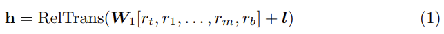 여기서 h = [ht, h1…hm, hb]는 각 visual 토큰의 임베딩을 나타냅니다. RelTrans(·)는 relation Transformer 모듈이며, W1은 학습 가능한 파리미터이고 l은 각 토큰의 위치 임베딩입니다