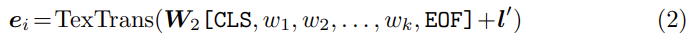 여기서 ci = [w1, w2, . . . , wk]는 region ri의 dense caption에 포함된 k개의 단어를 나타내고, l′은 각 토큰에 대한 위치 임베딩입니다. [CLS]와 [EOF]는 각각 첫 번째와 마지막 단어를 나타내는 학습 가능한 토큰입니다.