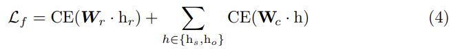 여기서 hr은 주어(rs)와 목적어(ro)의 결합 영역의 임베딩을 나타냅니다. hr = LN(hs, hso, ho)는 LN(.) linear project function을 나타냅니다. Wr은 랜덤 초기화된 분류기입니다. relation 분류와 달리, 저자는 객체 레이블을 예측하기 위해 제로샷 분류 설정을 사용합니다. 즉, 사전 학습된 텍스트 인코더로부터 객체 범주들의 고정된 임베딩 Wc를 사용하여 객체 분류기로 사용합니다. 이 방식으로 모델은 이전에 보지 못한 객체 범주도 예측할 수 있습니다.