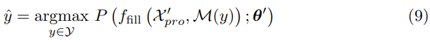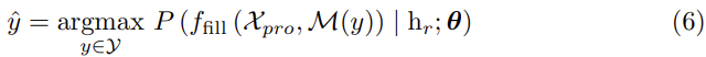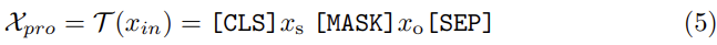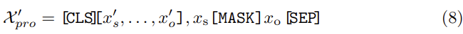 여기서 θ′는 T의 학습 가능한 파라미터이며, VRM은 고정됩니다. 이렇게 하면, 저자는 X′pro를 마스킹된 언어 모델의 입력으로 보고, 사전 학습된 TexTrans 네트워크에 넣어 [MASK]의 확률을 최대화하는 토큰을 찾습니다. 따라서 예측을 다음과 같이 다시 작성할 수 있습니다: