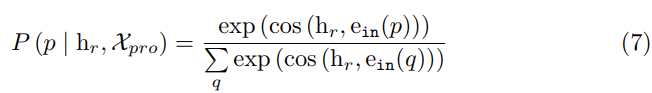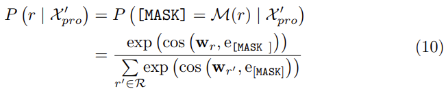 ffill(.)은 Xpro의 [MASK] 슬롯을 레이블 단어 M(r) ∈ V로 채우는 함수이며, hr = LN(hs, hso, ho)는 Eq. (4)에서 정의된 것과 같습니다. θ는  linear projection function LN과 VRM의 파라미터입니다. prediction score P는 코사인 유사도를 사용하여 계산합니다: