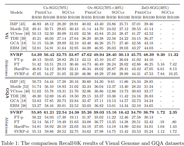Cs-SGG : 기존 closed setting에서, 저자는 VG와 GQA에서 SVRP가 최근 SOTA 모델인 GCA와 EBM을 포함한 모든 baselines보다 일관되게 뛰어나다는 것을 확인할 수 있습니다. 예를 들어, VG에서 SVRP는 PredCls와 SGCls task에서 EBM과 비교했을 때 평균적으로 각각 1.55과 1.02의 향상을 보였습니다. IMP와 Motifs 모델과 비교했을때 SVRP는 더 큰 차이로 성능을 뛰어넘습니다.