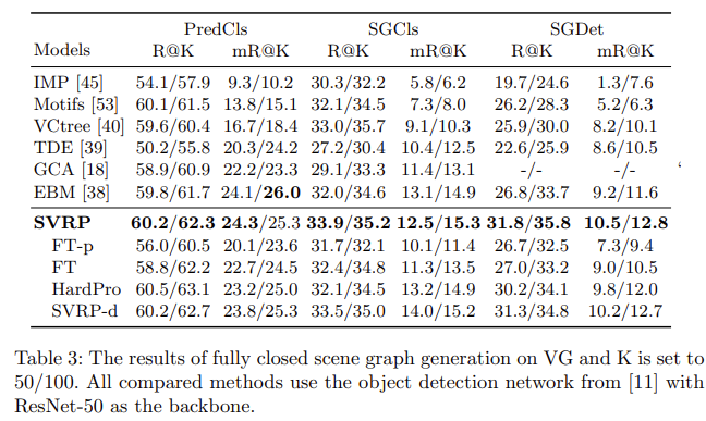 Fully-closed scene graph generation : 저자는 추가로 Fully-closed scene graph generation 위한 저자의 방법론을 평가했습니다. 표 3의 결과에서, 저자는 PredCls task에서 mR@100을 제외하고, 저자의 SVRP가 모든 baselines을 능가한다는 것을 확인할 수 있었습니다.
