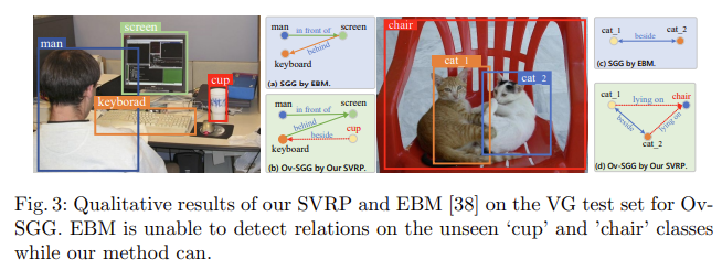 Qualitative analysis : Ov-SGG task에서, 저자는 저자의 기술과 대표적인 closed SGG 모델인 EBM이 생성한 장면 그래프를 시각화했습니다. 그림 3에서 왼쪽 이미지를 보면, EBM은 보지 못한 대상 object “cup”에 대한 어떠한 관계도 감지하지 못하지만, 저자의 SVRP는 키보드와 컵 사이의 “beside”라는 관계를 예측할 수 있습니다. 마찬가지로 오른쪽 이미지에서도, EBM은 보지 못한 object 클래스 “chair”에 대한 예측을 하지 못하지만, 저자의 방법은 예측할 수 있습니다.