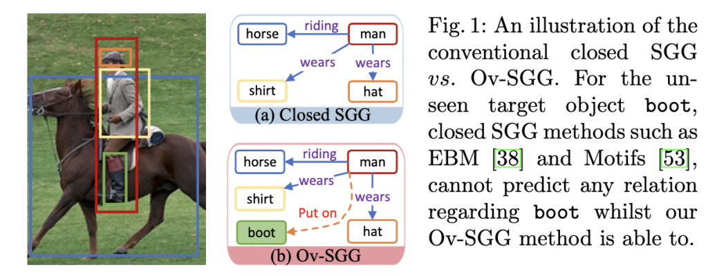 Scene Graph Generation (SGG)은 주어진 이미지에서 visual relation triplets을 생성하는 것을 목표로 하는 task입니다. SGG는 visual captioning , visual question answering, 3D scene understanding와 같은 다양한 task에서 널리 사용됩니다. 하지만 이런 SGG 연구들은 이전까지 사전 정의된 object class 간의 relation 예측에만 국한되어 있는 한계점을 가지고 있습니다. 실제 시나리오에서는 SGG 모델이 훈련 세트에서 unseen category의 object를 만날 가능성이 큽니다. 이러한 더 현실적인 환경에서는 기존 SGG 모델들의 성능이 저하되며, 특히 unseen object class를 추론할 때 성능이 급격히 떨어집니다. 따라서 저자는 unseen objects에 대해 visual relation를 예측할 수 있는 모델을 개발하고자 하였고 이 문제 설정을 저자는 Open-vocabulary Scene Graph Generation (Ov-SGG)이라고 부릅니다.