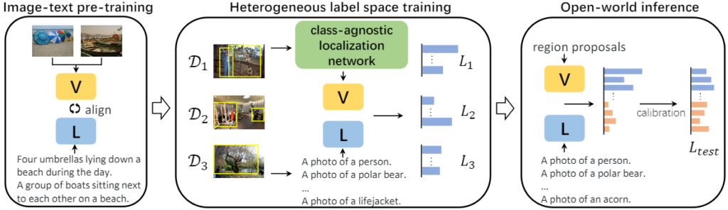우선, 대전제는 이미지 I 에 대해 object detection은 해당 이미지의 라벨, \{(b_i, c_i)\}^m_{i=1} , ( b_i, c_i 는 각각 bounding box coordinate와 category label)을 예측합니다. 일반적으로 모델은 \mathcal{D}_{train} = \{(I_1, y_1), ..., (I_n, y_n)\} 의 이미지와 라벨로 구성된 단일 dataset을 활용하며, 해당 dataset의 test dataset, \mathcal{D}_{test} 에서 추론 결과를 벤치마킹합니다. 하지만 이처럼 단일 dataset이라함은 곧 closed-world로, dataset은 해당 dataset의 label space, \mathcal{D}_{train} = \mathcal{D}_{test} = L 에 한정됩니다. 저자의 핵심 목표는 다양한 source, \mathcal{D}_{train_1}, \mathcal{D}_{train_2}, ..., \mathcal{D}_{train_N}, 의 다양한 dataset에서 각각의 label space L_1, L_2, ..., L_N 의 heterogeneous label space를 동시에 학습할 수 있으며 추론 시에는 새로운 label space, L_{test} 에 대해 추론할 수 있어야 합니다.
