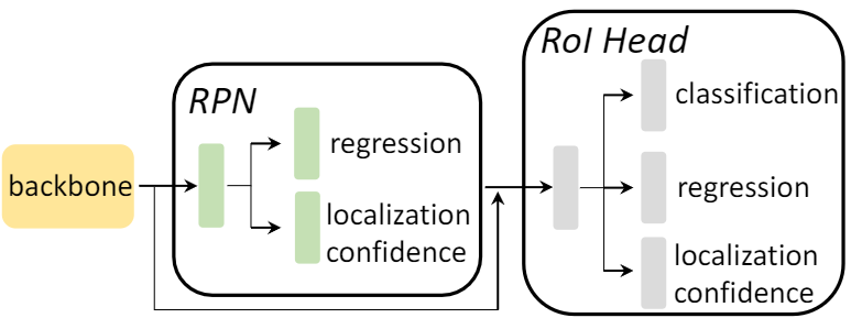 저자는 또한, 앞서 proposal을 만드는 과정에서 단순히 RPN만 참여함이 아니라 RoI Head도 proposal에 대한 score을 생성하도록 합니다. 이에 대한 부분이 위 그림에서 backbone에서의 feature가 RoI Head에도 참여된다는 모습에서 알 수 있습니다. 특히 localization confidence라는 부분이 곧 novel class에 대해 탐지하는 데 효과적인 기능을 하므로, RoI head에서 localization confidence를 내뱉으며, 해당 모듈에서도 binary class-agnostic classification을 수행하도록 합니다. 이를 통해 최종적으로 i번째 proposal에 대해 RPN에 해당 localization confidence는 둘의 localization confidence와 RoI Head의 classification score의 곱으로 연산됩니다. 이 값이 바로 위 probability calibration의 \eta , \eta_{i} = (s^c_i)^\alpha \cdot (s^{r1}_i s^{r2}_i)^(1-\alpha) 에 해당합니다. 제 논문의 실험을 위해 localization confidence를 어떻게 (정의)구하는지 코드를 한번 살펴봐야겠네요.