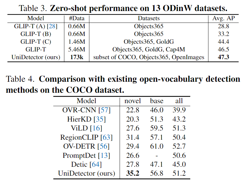 이 때 학습한 dataset은 곧 heterogeneous label space에 영향을 미칠텐데, 저자는 COCO, Object365, OpenImages를 활용합니다. COCO는 80개의 카테고리, Object365는 COCO보다 더 방대한 양의 365개의 카테고리, OpenImages는 web-scale 수준의 500개 카테고리를 보유하나 해당 dataset은 다소 annotation의 대부분이 sparse하거나 또는 noisy (dirty)합니다. Test dataset으로는 long-tailed 분포로 유명한 LVIS, 그리고 ImageNetBoxes, VisualGenome dataset을 활용하여 open-world 성능을 평가합니다. ImageNetBoxes, VisualGenome는 처음 들어보았는데, 정말 시간이 갈수록 다양한 dataset들이 많이 존재하네요.