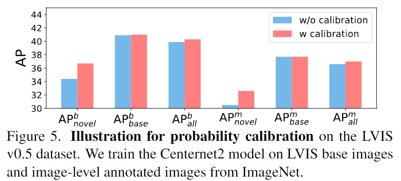 – 저자는 open-world에서 finetuning 없이 추론해야 함을 언급하며, 학습한 object detector와 test vocabulary로부터 추출한 language embedding을 활용합니다. 이 때, novel 카테고리는 학습 시 본 적이 없기 때문에, detector는 해당 카테고리의 객체에 대해 under-confidence한 결과를 보입니다. under-confidence란 곧 최종 예측에서 제외될 가능성이 높다는 의미입니다. 이를 극복하고자 저자는 probability calibration을 통해 base/novel 카테고리 사이 균형을 맞추길 원합니다.
