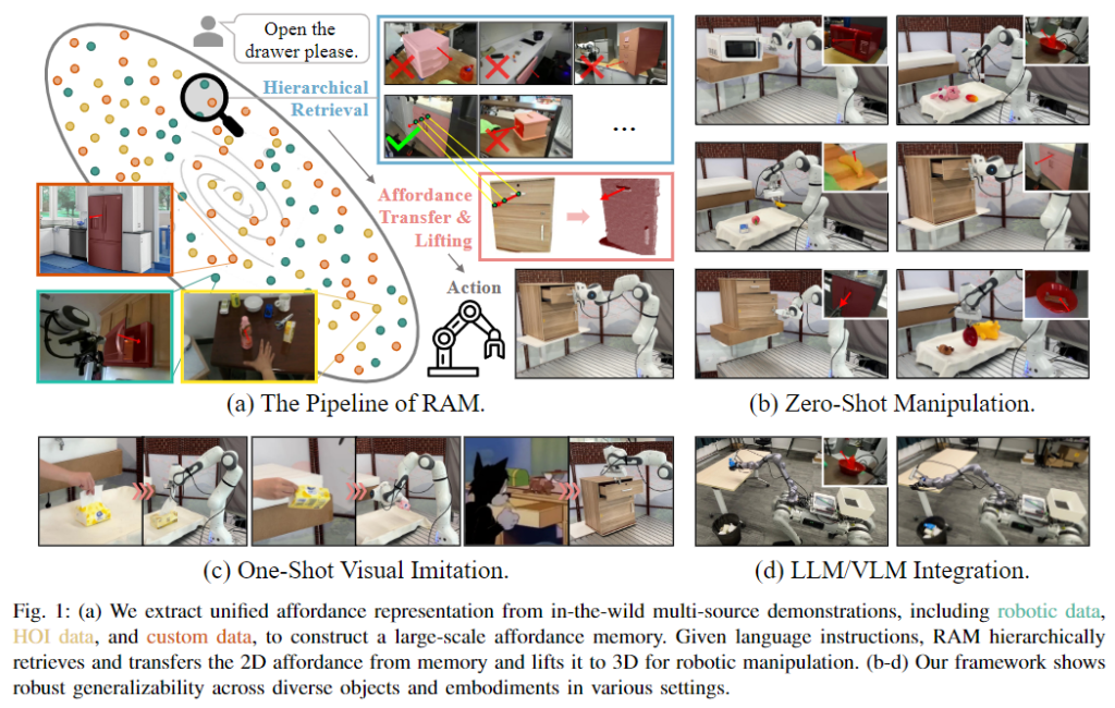 해당 논문은 retrieval 기반의 zero-shot 프레임워크인 RAM을 제안하여 다양한 사물과 환경에 대해 일반화 가능한 특징을 생성하는 것을 목적으로 합니다. 기존의 비싼 학습 기반의 접근 방식과 달리 RAM은 retrieval 기반의 프레임워크를 통해 외부 데이터에서 다양한 조작 기능을 습득하는 방식으로 이루어집니다. RAM은 사람과 인간의 상호작용 데이터(Human-Object Interaction, HOI)와 사용자 데이터 등 다양한 데모 자료들로부터 대규모 affordance 메모리를 구축한 뒤, 언어 지시가 주어졌을 때 affordance 메모리에서 가장 유사한 데모를 계층적으로 검색하여 외부 정보인 2D affordance 정보를 3D의 actionable affordance로 전환합니다. 다양한 시뮬레이션과 평가를 통해 RAM일 기존 작업보다 일관적으로 성능이 뛰어나다는 것을 입증하였으며, 자동적이고 효율적으로 데이터를 수집할 수 있고 다운스트림 테스크에 잠재력이 있음을 보였다고 합니다.