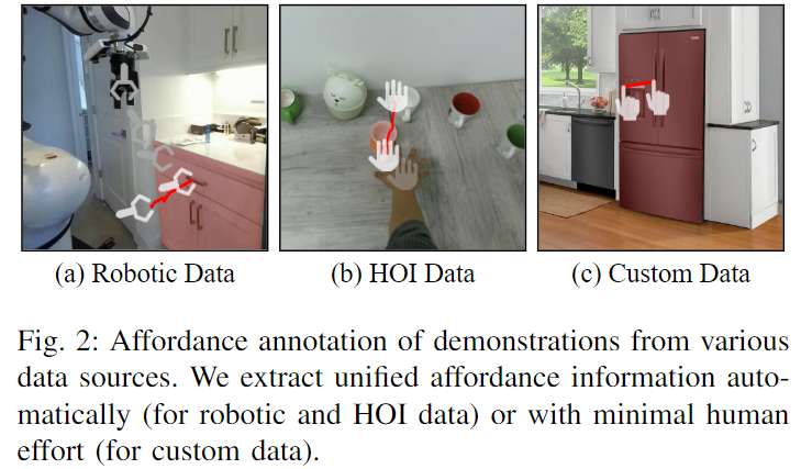 - HOI Data: 사람이 객체와 상호작용하는 데이터로, affordance 추출을 위해 affordance가 발생하는 비디오 영역을 식별한 뒤, Robotic 데이터와 유사하게 첫 프레임을 I^{\mathcal{S}}를 선정하고 여러 프레임에서 손의 keypoint를 평균화하여 contact point 와 trajectory point들을 결정하여 2D waypoints를 생성합니다. 이를 위해 HOI4D^{[2]} 데이터의 비디오 segment와 손에 대한 keypoint annotation 정보를 활용하였다고합니다.