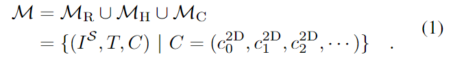 일반화를 위해 RAM은 대규모 affordance memory를 구축하는 것에 집중합니다. 이는 실제와 합성 로봇의 데이터 \mathcal{M}_R과 HOI 데이터 \mathcal{M}_H, 사용자 데이터 \mathcal{M}_C를 통합하여 구축합니다. 다양한 데이터로부터 affordance 정보를 통합하기 위해 \mathcal{M}의 각 항목은 object-centric RGB 이미지I^{\mathcal{S}}(affordance에서 object-centric이란 객체 이미지로 이해하시면 됩니다)와 2D waypoints C=(c^{2D}_0, c^{2D}_1, ...) ( c^{2D}_0는 contact point, 이후는 contact 경로를 의미합니다)를 의미하며 작업 종류에 대한 자연어 T로 구성됩니다.
