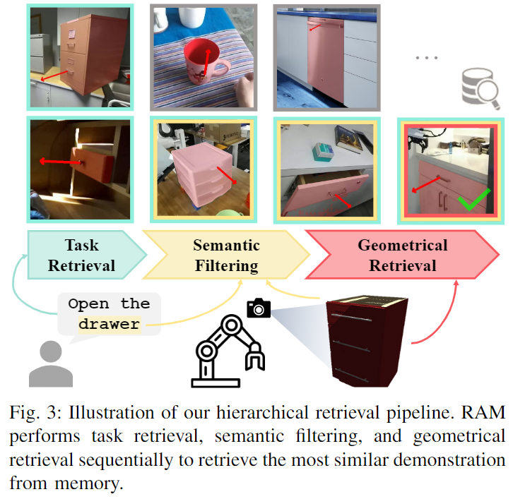 사람은 새로운 물체를 조작하기 위해 유사한 시나리오의 기억을 떠올려 그에 대한 조작 방식을 얻습니다. 위의 Fig. 3에서 볼 수 있듯 인간의 사고방식과 RAG(Retrieval-Augmented Generation)에서의 LLM의 추론으로부터 영감을 받아 RAM은 \mathcal{M}로부터 가장 유사한 데모를 coarse-to-fine 방식으로 검색하고, 이를 조작에 대한 힌트로 사용하는 3단계의 계층적인 검색 파이프라인을 제안합니다.