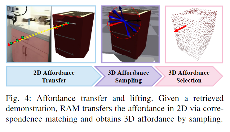 데이터 부족 문제를 해결하기 위해 RAM은 외부 도메인의 지식을 대상 unseen 도메인으로 전송하고자 하였으며, 이를 위해 retrieve-and-transfer 방식을 도입합니다. 2D affordance를 예측하는 기존의 방식과 다르게 RAM은 실행 가능한 3D affordance \mathcal{A}^{3D} = (c^{3D},\tau^{3D}), c^{3D},\tau^{3D} \in \mathbb{R}^3 를 생성합니다.