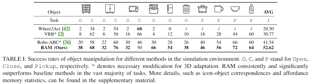 Table 1은 시뮬레이션 실험의 결과로, 대부분의 작업이 기존 연구에 비해 좋은 성능을 달성하였으며, 평균 성공률은 52.62%로 상당한 개선이 이루어졌음을 확인할 수 있습니다. Where2Act는 정확한 contact 지점과 잡는 자세가 필요한 “open” task에서 대부분 실패하였으며, VRB 방식도 정확한 contact 지점을 찾는 데 어려움을 겪어 “open”이나 “pickup”에서 낮은 성공률을 보였습니다. Robo-ABC*는 기존의 학습 기반의 graping을 위한 contact point를 찾는 연구에 공정한 비교를 위해 affordance memory를 공유하도록 변경한 버전으로, 두번째로 좋은 성능을 보였으며,