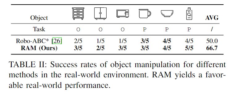 Table 2는 실제 환경에서의 성공률을 측정한 것으로, 6개의 작업 대한 Robo-ABC와의 비교결과입니다. 실험을 통해 기존 방식의 성능을 능가하는 것을 확인할 수 있습니다.