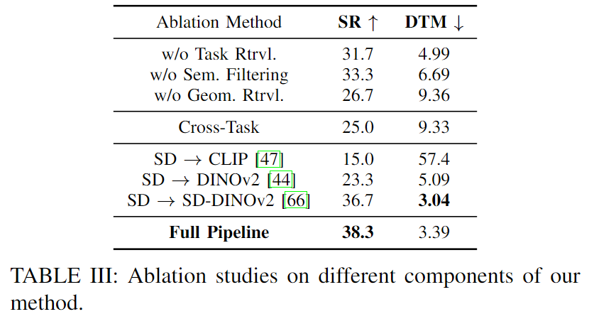 1~3행이 계층적인 retrieval 파이프라인의 서브모듈을 제거한 실험 결과로, SR과 DTM이 저하되며 특히 Geometrical Retrieval을 제거할 경우 SR 성능이 38.3%에서 26.7%로 크게 저하됨을 확인할 수 있습니다. 이를 통해 기하학적으로 정렬이 맞는 데모를 찾는 것의 중요성을 보였습니다. - Cross-Task Transfer