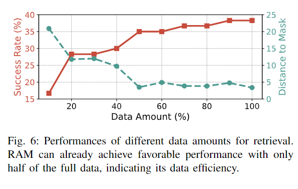 위의 Fig.6은 \mathcal{M} 양에 따른 성능을 타나낸 것 입니다. 각 작업의 retrieval memory를 전체에서 최소10%~100%로 변경하며 실험을 진행하였으며, 그 결과 데이터 양이 증가할수록 전반적인 성능이 개선되는 것을 확인할 수 있습니다. 특히 50% 부터 100% 사이는 비슷한 결과를 얻을 수 있음을 통해 RAM의 데이터 효율성을 보였다고 합니다.
