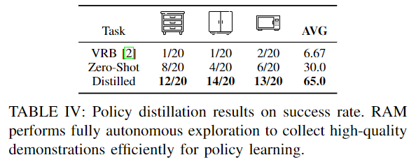 RAM은 zero-shot 기반의 언어명령 로봇 조작 방식으로, 인간의 사전 지식이나 보상 없이 효과적으로 주변환경을 탐색할 수 있습니다. zero-shot 파이프라인을 활용하며, 서랍, 캐비닛, 전자레인지를 여는 데 성공한 데모를 자동으로 수집한 뒤, 이로부터 ACT 정책을 학습하였다고 합니다. Table 5는 기존 방식과 zero-shot 성능, 50개의 데모를 사용할 경우(Distilled)에 대한 실험 결과로, zero-shot으로부터 +35%의 성능 개선을 통해 이후 고품질의 데이터 수집이 가능할 것이라는 점을 어필합니다.(즉, 해당 파이프라인에 50개 이상의 데모를 사용할 경우 높은 성공률을 통해 고품질의 데이터 수집이 가능해질 것이라고 이해하였습니다.)