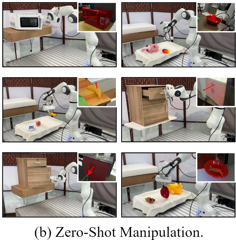 실제 환경에서 다양한 객체와 상호작용이 가능한지를 실험하였으며, Franka Emika 로봇 팔을 사용하고, 손에 RGBD 센서로 RealSense D415를 사용하였다고 합니다. 또한 Z1 로봇팔과 B1 로봇 개도 활용하여 저자들이 제안한 방식이 다양한 embodiment에서 성능을 확인하였다고 합니다.