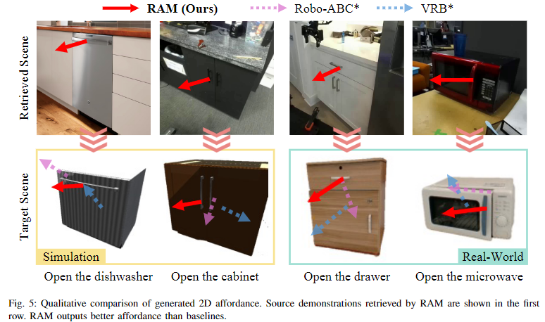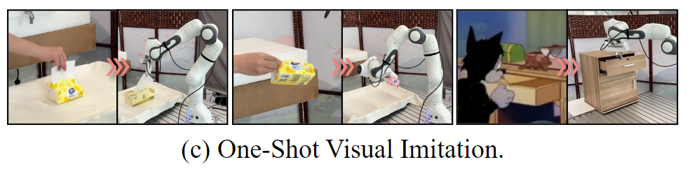 도메인 외의 지식을 검색하는 것 외에도 특정 도메인 정보가 주어졌을 때의 one-shot 방식의 visual imitation에 적용한 실험 결과입니다. 위의 이미지와 같이 티슈나 티슈 박스를 집는 데모가 주어졌을 때, 이에 대한 시각적 모방을 수행할 수 있으며, 톰과제리 예시는 만화 이미지의 데모를 보고도 서랍을 열 수 있음을 보여준다고 합니다.(이에 대한 정량적 결과는 따로 존재하지 않으며, geometrical retrieval에 부합하지 않는 케이스인데도 잘 작동하는지는 의문입니다..)