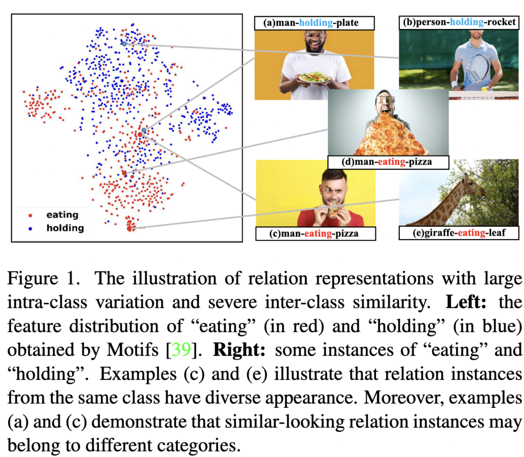 - 클래스 간 유사성(Inter-class similarity)은 시각적으로 유사한 이미지가 서로 다른 술어 클래스에 속할 때 발생합니다. 예를 들어, 그림 1(a)와 그림 1(c)에서 “man-pizza”와 “man-plate” 처럼 시각적으로 유사한 모습은 SGG 모델이 “eating”과 “holding”을 구별하기 어렵게 만듭니다.