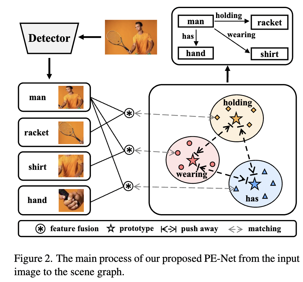Prototype-based Embedding Network (PE-Net)은 두 단계로 나눌 수 있습니다: 1) Prototype-based Modeling을 통해 압축적이고 구별 가능한 객체와 술어 표현을 생성합니다. 2) Prototype-guided Entity-Predicate Matching을 통해 관계 인식을 수행합니다.