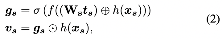 여기서 f(·)는 fully connected layer, h(·)**는 시각적 특징을 semantics 공간으로 변환하는 visual-semantic function을 나타냅니다. xs는 detector에서 얻은 주어 인스턴스의 시각적 특징입니다. 식(2)의 게이트 메커니즘을 사용하여, 클래스와 무관한 정보가 원래 시각적 특징에서 제거되어 클래스 내에서 일관된 표현을 생성합니다. 같은 방식으로 vo도 식(2)를 따라 도출됩니다.