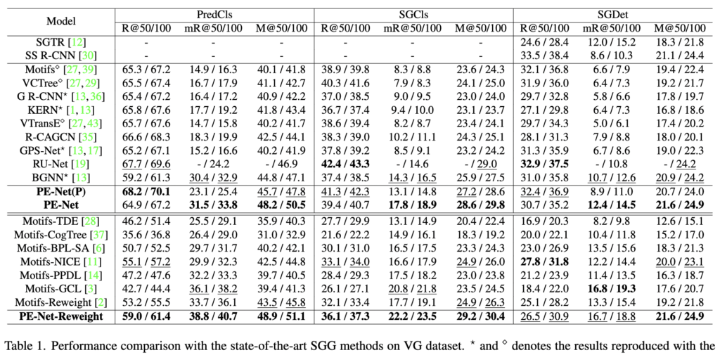 - Visual Genome: PE-Net의 씬 그래프 생성 성능을 평가하기 위해 VG 데이터셋에서 세 가지 하위 task(PredCls, SGCls, SGDet) 모두에 대해 최신 SGG 방법들과 비교했습니다. 결과는 표 1에 나와 있습니다. 일반적으로, 저자의 방법은 다른 SGG 모델들보다 우수한 성능을 보여주고 있습니다.