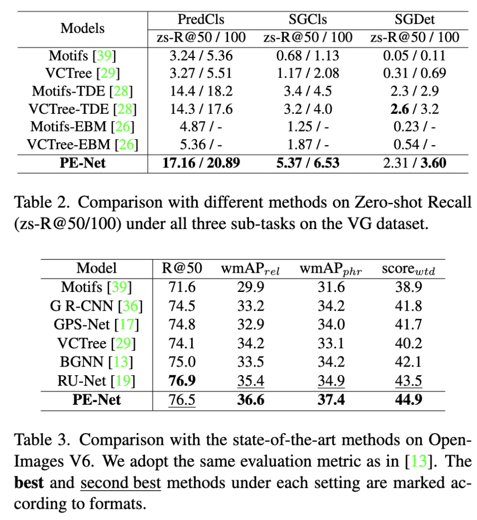 - Open Images: 다양한 데이터셋에서 방법의 일반성을 검증하기 위해 Open Images에서도 실험을 수행했으며, 결과는 표 3에 제시되어 있습니다. PE-Net은 Open Images 데이터셋에서도 좋은 결과를 얻었습니다.