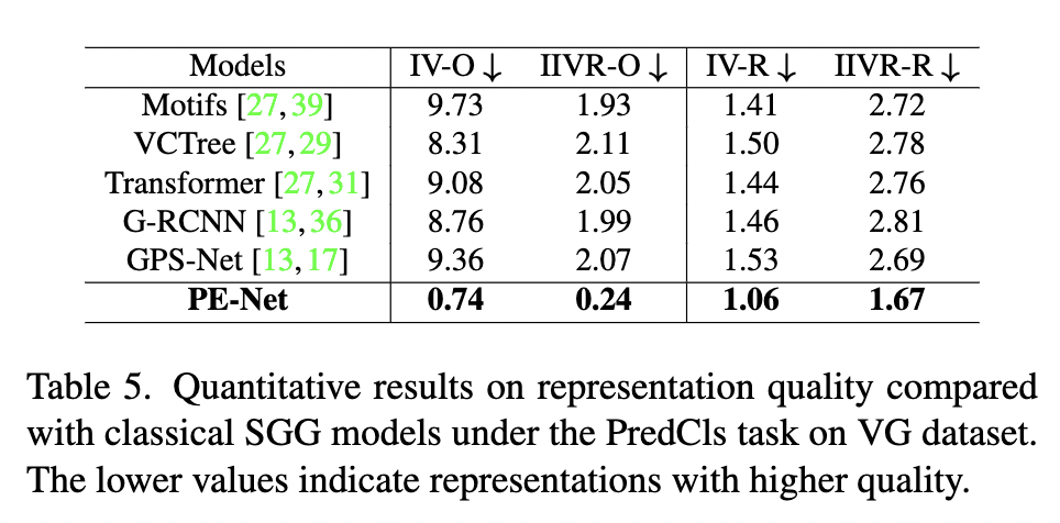 PE-Net이 객체와 술어에 대해 압축적이고 구별되는 표현을 생성할 수 있다는 가정을 입증하기 위해, 저자는 표 5와 그림 4에서 각각 정량적 및 정성적 연구를 수행합니다.