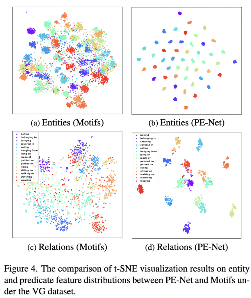 정성적 분석: 저자는 t-SNE 기법을 사용하여 객체와 술어의 특징 분포를 시각화하였으며, 그 결과는 그림 4에 나와 있습니다. 그림 4(a)와 그림 4(b)를 비교하면, PE-Net이 Motifs보다 더 구별되는 객체 표현을 생성하는 것을 알 수 있습니다. 또한, 그림 4(c)에 나타난 Motifs의 관계 특징 분포는 클래스 내 변동성이 크고, 클래스 간 중첩이 심한 것을 보여줍니다. 이러한 경우, SGG 모델이 정확한 관계 인식을 위한 완벽한 결정 경계를 학습하기 어렵습니다. 반면, PE-Net이 학습한 관계 표현은 클래스 간 구별성과 클래스 내 압축성이 높아 관계 예측 성능을 더 정확하게 할 수 있습니다.