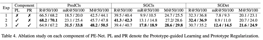 Ablation Studies의 결과는 표 4에 요약되어 있습니다. 실험 1에서는 PE-Net을 PL과 PR 없이 훈련합니다. 실험 2에서는 PL을 사용하여 PE-Net을 훈련했고, 실험 3에서는 PL과 PR을 모두 사용하여 PE-Net을 훈련했습니다. 실험 2에서 모델은 세 가지 하위 task에서 모든 지표에서 베이스라인(실험 1)을 능가했으며, PredCls에서 mR@100에서 25.4% vs. 20.0%, R@100에서 70.1% vs. 68.2%를 달성했습니다. 이는 PL이 PE-Net이 객체와 술어 간의 매칭을 하는데 효과적이라는 것을 확인할 수 있습니다. 실험 3에서 PR과 통합된 후, PE-Net은 mR@K에서 상당한 성과를 거두었는데 이는 PR이 프로토타입 간의 구분을 확대하여 객체-술어 매칭을 달성하는 데 효과적임을 보여줍니다.