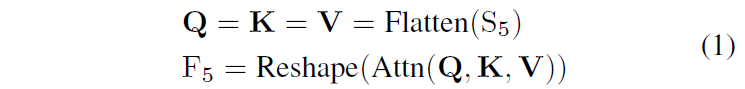 Attn은 multi-head self-attention이고, Reshape은 Flatten을 거꾸로 수행하는것이라고 생각하시면 됩니다. F_{5}의 shape은 S_{5}와 동일합니다.