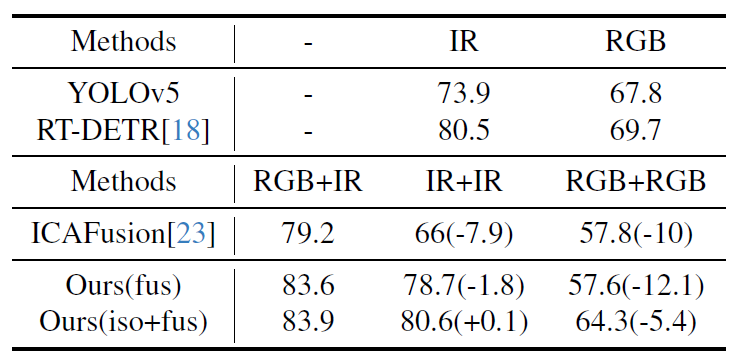 실세계에서 multispectral detector를 사용하는 상황을 가정해보면 (센서 고장이나 occlusion 발생 등으로)모달리티 한 쪽입력이 정상적으로 들어오지 않는 상황이 발생할 수 있습니다. 저자들은 이러한 modal drop 상황에 대한 실험을 수행하였습니다. 데이터 인풋은 single modality image를 복사해서 입력하였다고 합니다.
