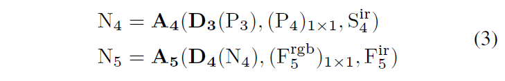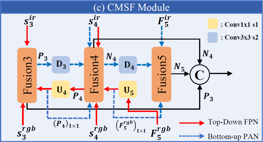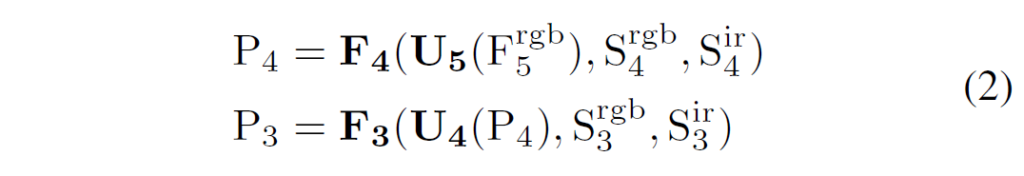 저자들은 RGB 및 IR multispectral 영상의 특성에서 영감을 얻어 cross-modality, cross-scale feature fusion을 위한 모듈을 제안합니다. 구조는 PANet 과 같은 구조를 사용하며, 1.Top-Down FPN과 2.Bottom-Up PAN이라는 두 branch로 구성됩니다. 먼저 풍부한 feature connection 정보를 가지는 F_{5}^{rgb} 를 사용해서 top-down upsampling을 수행하고 이후 IR feature들을 통합하기 위해 S_{4}^{ir}F_{5}^{ir}를 사용해 bottom-up downsampling을 수행합니다. 결과적으로 이 모듈에서는 RGB 및 IR 모달리티 모두의 multiscale 정보를 합성하는 feature pyramid를 만들어냅니다. FPN 처리 과정은 다음과 같이 나타낼 수 있습니다 :