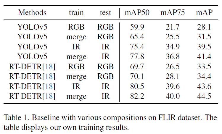 저자들은 두 모달리티 영상을 합쳐서 학습시키는게 모델에 정말로 긍정적인 영향을 미치는지 확인하기 위해 YOLOv5와 RT-DETR 모델로 merged FLIR dataset에 대해 실험을 수행하였습니다. 결과는 Table 1과 같습니다. 본래 베이스라인은 모델을 각각 IR / RGB로 학습시키도 동일 도메인 이미지로 평가를 진행한 것이고 이를 merged dataset으로 학습한 모델과 비교하였습니다. 실험 결과 전반적으로 YOLOv5보다 RT-DETR이 좋은 성능을 보였으며 train단계에서 단일 도메인만을 사용하지 않고 merged set을 활용한 것이 더 좋은 성능을 보임을 확인할 수 있습니다.