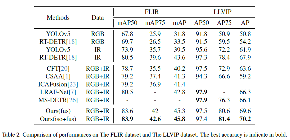 학습 데이터의 다양성을 고려해, 저자들은 두가지 학습 전략에 대해 실험을 진행했습니다. 우선 기존 연구와 유사하게 Fusion Stage로만 학습을 진행하였고(표에서 Ours(fus)로 표기), 두번째로는 학습 단계의 Isolatoin stage에서 IR와 RGB를 병합해 학습한 다음 Fusion stage에서 추가적으로 학습하여 결과를 보였습니다(표에서 Ours(iso_fus)로 표기). Table 2를 보시면 FLIR 및 LLVIP 데이터셋에 대해 저자가 제안한 방법이 기존 방법론들보다 개선된 결과를 보이거나 SOTA에 매우 근접한 성능을 내는 것을 확인할 수 있습니다. 또한 isolation stage를 추가한 것이 fusion stage로만 학습한 모델보다 개선된 성능을 보여 2-stage 학습 전략이 유효함을 확인할 수 있었습니다. 비교군에 있는 MS-DETR은 Deformable DETR 기반 multispectral detector라고 합니다.