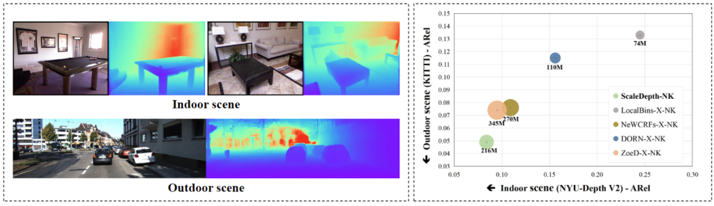 이후, depth estimation 연구를 한다면 모두가 아는 Zoedepth에서는 indoor과 outdoor의 depth prediction을 각각 수행하도록 하는 prediction head를 둡니다. 또 다른 연구에서는 가장 확실하게끔 카메라 파라미터를 입력으로 주어 scale의 모호함을 풀거나, 다양한 시나리오를 품은 단일이 아닌 다중(indoor+outdoor) 데이터를 활용합니다. 저자는 하지만 그들의 방법론이 모두 “scene scale”을 모델링함에 부족하다고 생각합니다. 앞서 설명드린 내용처럼, scale을 안다면 RDE를 MDE로 변환시킴은 다소 쉽습니다. 다만, 그 scale이 여태 문제였는데 이전의 방법들이 점차 “데이터 박치기공룡”으로 변화해간다는 점을 문제 삼습니다. 즉, 다른 말로는 “그 중요한 scale을 모델링하여 예측해야하는거 아니냐”는 시선입니다. arXiv에 등재된 논문이지만, 좋은 발상으로 보입니다. (저자에 대해 잠깐 찾아보았는데, 2023년부터 매년 2-3편의 탑티어 저널/학회를 1저자급에서 등재시키는 착실한 중국 청년이네요)