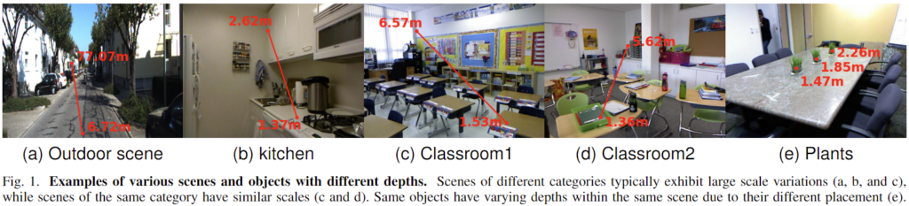 (a)에서 (e)까지, 어떤 scene인지에 따라 실 거리 차이가 달라집니다. 동일한 사진 크기로 맞추었으니, 화살표의 길이로 우리가 유추했을 때 (a)와 (b)는 물론 3차원 상 축을 고려하고서라도 유사한 화살표 길이에서 범위의 차이가 어마어마합니다 ((a)에서는 약 70M, (b)에서는 약 1M). 반면, (c)와 (d)에서는 교실이라는 동일한 공간에서 거리 범위/차이는 얼추 유사합니다. 이 차이로 인해 현존 MDE의 발전은 아직 Zoedepth의 “indoor/outdoor를 구분하여 각각 따로 진행”하는 수준에 머물러 있으며, 그러므로 만약 저자가 scene에 대한 scale을 명시적으로 모델링할 수 있다면, 이제 모델이 할 일은 단지 RDE밖에 남지 않았습니다. 그 RDE는 MDE보다 훨씬 쉬운 문제로, “데이터 박치기 공룡”의 대표적인 depth anything과 같은 foundation model이 존재합니다.