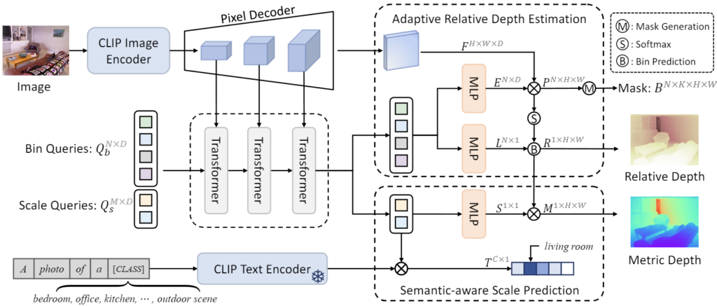 위 figure를 참조하며 전체적인 구성을 살펴보겠습니다. 위 figure를 보았을 때, CLIP이 사용되며 저자가 제안하는 Adaptive Relative Depth Estimation (ARDE)와 Semantic-aware Scale Prediction (SASP) 모듈이 존재하지만, 제 생각에서 핵심은 결국 Bin query와 Scale query입니다. 이 때의 bin과 scale은 위 단락에서 손 아프게 설명하였으니, 우리는 그들의 역할에 대해서는 잘 알고 있습니다.