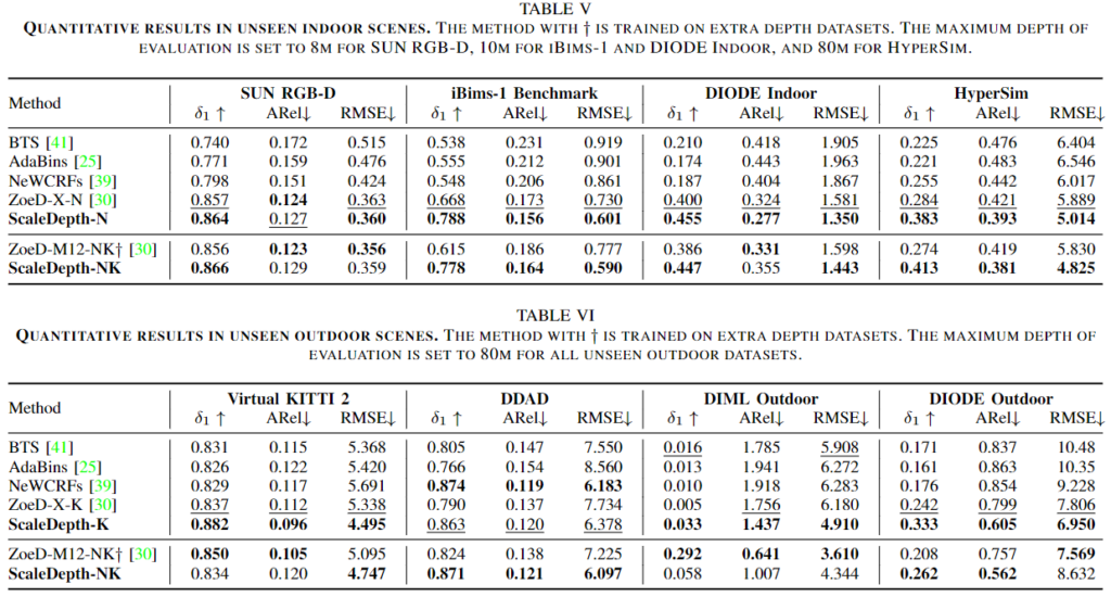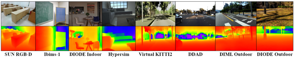 우선, 위 loss functioni에서 눈치채셨겠지만 모델 학습을 위해서는 rgb 이미지와, (metric-scale) depth 이미지가 필요합니다. 이를 위해 데이터 세트는 indoor 환경의 NYU-Depth V2, outdoor 환경의 KITTI, 그리고 zero-shot evaluation을 위한 8가지의 unseen 데이터 세트 (SUN RGB-D, iBims-1Benchmark, DIODE Indoor, HyerSim (여기까지 indoor), Virtual KITTI 2, DDAD, DIML (Outdoor, DIODE Outdoor (여기까지 outdoor) 데이터 세트를 활용합니다. 이들에 대해서는 zero-shot evaluation을 진행하므로, depth range가 존재하지 않습니다.