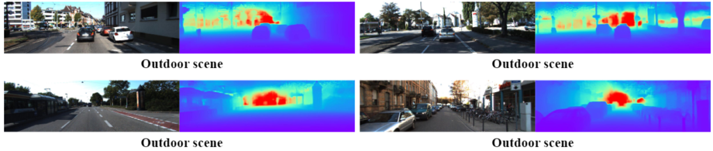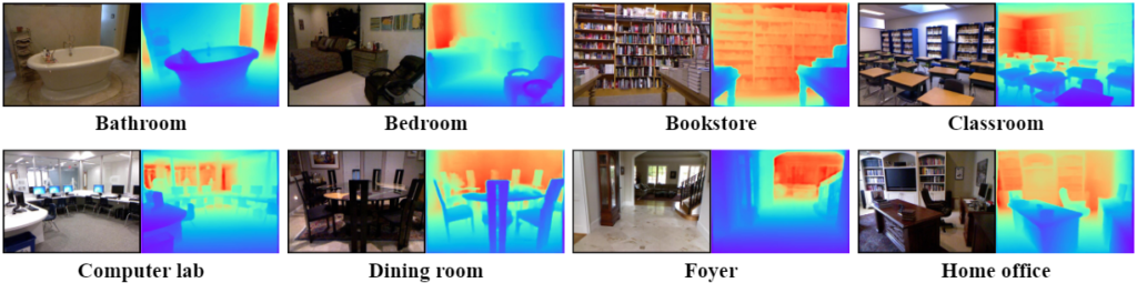 저자는 현존하는 MDE 방법들이 “다양한 range에서 정확한 depth를 예측할 수 있는 구심점”, “scene scale”의 영향력을 간과하고 있다고 꼬집는데, 조금 더 자세히 살펴보자면 (1) 우리는 scene에 대한 카테고리를 작은 범주에서는 “교실”, “행사장”, “고속도로”와 같이 또는 큰 범주에서는 “실내”, “실외”와 같이 정의할 수 있는데, 이들에 따라 depth에 대한 range (min-max 또는 객체간의)는 굉장히 크게 달라질 수 있습니다. 이 말은 반대로는 동일한 scene에서는 range에 대한 차이가 적음을 의미합니다. 아래 사진을 보시죠.