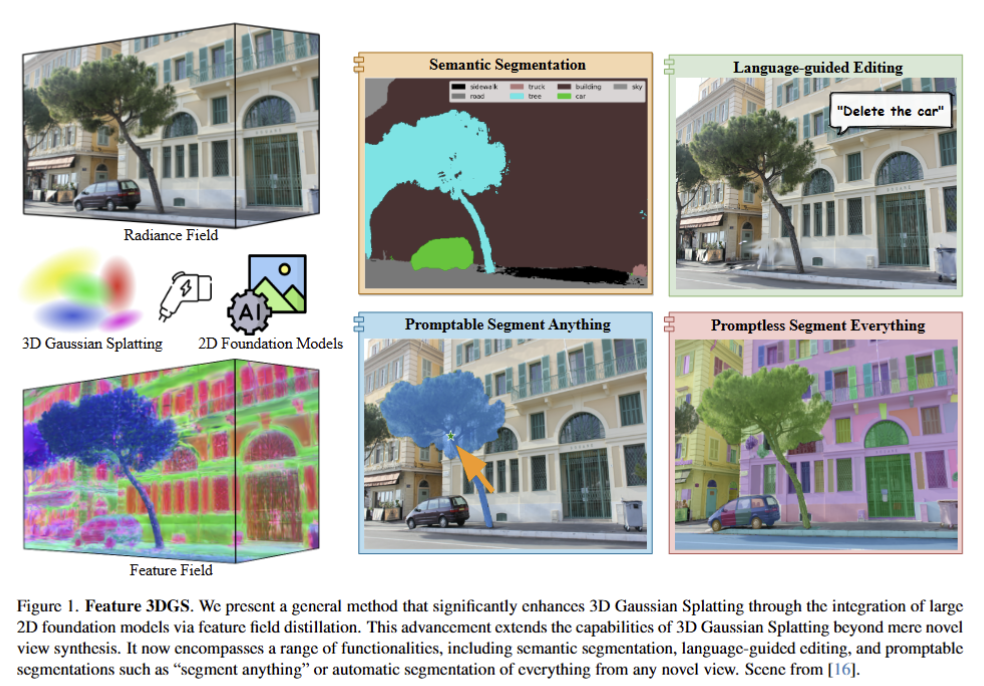 특히, 2D foundation model(e.g. CLIP, SAM)이 2D 이미지에서 탁월한 성능을 보여주고 있지만, 이를 3D 공간에 적용하는 방법은 여전히 초기 연구 단계에 머물러 있습니다. 3D Gaussian Splatting(3DGS)는 이러한 시각적 표현을 효율적으로 처리할 수 있는 새로운 방식으로 떠오르고 있지만, 여전히 의미 정보를 통합하여 세그멘테이션이나 언어 기반 편집을 지원하는 데 있어 부족함이 존재합니다.